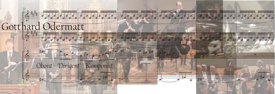 Übersicht Werkverzeichnis von Gotthard Odermatt / Complete works by Gotthard OdermattWerkverzeichnis_Odermatt_2025d_Deutsch.pdf (pdf deutsch)Compositions_Gotthard_Odermatt_2025d_english.pdf (pdf english) Bläseroktett, Op. 15 / Wind Octett, Op. 15» infosBläseroktett, Op. 15b / Wind Octett, Op. 15b» infosBläserquintett in E-Dur, Op. 16 / Wind Quintett, Op. 16» infosZeit und Stunde, Op. 17 / A Time for Everything, Op. 17» infosTrois images pour hautbois et orchestre, Op. 18 (Oboenkonzert) / Three Pictures for Oboe and Orchestra, Op. 18 (oboe concerto)» infosConcertino für Oboe d'amore und Streicher, Op. 19 / Concertino for Oboe d'amore and Strings, Op. 19» infosFünf Miniaturen, Op. 20 / Five Miniatures, Op. 20» infosFünf Miniaturen, Op. 20b / Five Miniatures, Op. 20b» infosFünf Miniaturen, Op. 20c / Five Miniatures, Op. 20c» infosSternbilder-Suite, Op. 21 / Constellations-Suite, Op. 21» infosSternbilder-Suite, Op. 21b / Constellations-Suite, Op. 21b» infosSternbilder-Suite, Op. 21c / Constellations-Suite, Op. 21c» infosSternbilder-Suite, Op. 21d / Constellations-Suite, Op. 21d» infosles couleurs de l'eau, Op. 22 (Oboensonate) / The Colors of the Water, Op. 22 (oboe sonata)» infosles couleurs de l'eau, Op. 22b (Oboenkonzert) / The Colors of the Water, Op. 22b (oboe concerto)» infosles couleurs de l'eau, Op. 22 (Sonate für Sopransaxophon oder Klarinette in B) / The Colors the Water, Op. 22 (Sonata for Soprano saxophone or Clarinet)» infosCapriccio a due, Op. 23» infosMondes féeriques, Op. 24 / Magical worlds, Op. 24» infosRéminiscences, Op. 25 / Reminiscences, Op. 25» infosRéminiscences, Op. 25b / Reminiscences, Op. 25b» infosVariationen über ein Thema von Paganini, Op. 26 / Variations on a Theme of Paganini, Op. 26» infosVariationen über ein Thema von Paganini, Op. 26b / Variations on a Theme of Paganini, Op. 26b» infosVariationen über zwei Arien aus der „Zauberflöte“ von Mozart, Op. 27 / Variations on Two Arias from Mozarts “ “The Magic Flute”, Op. 27» infosKonzert für Klarinette und Orchester, Op. 28/Concerto for Clarinet and Orchestra, Op. 28» infosOboenkonzert in F-Dur, Op. 29 (nach KV293) Oboe Concerto in F, Op. 29 (after KV293)» infosVitraux, Op. 30/church windows, Op. 30» infosBläserserenade, Op. 31/Serenade for Wind Instrumens, Op. 31» infosI tre Castelli, Op. 32/The three castles, Op. 32» infosDie Nereiden, Op. 33/The Nereids Op. 33» infosNorwegische Polarlichter, Op. 34/Norwegian Northern Lights, Op. 34» infosLe bruissement du vent, Op. 35 / The Rustle of the Wind, Op. 35» infosSchattenspiele, Op. 36/Shadow Play, Op. 36» infosThema und Variationen, Op. 37» infosKonzert für Horn und Orchester, Op. 38» infosStimmungsbilder, Op. 39» infosWiegenlied, Op. 40» infosAndromeda, Op. 41» infosStreicherserenade, Op. 42» infos